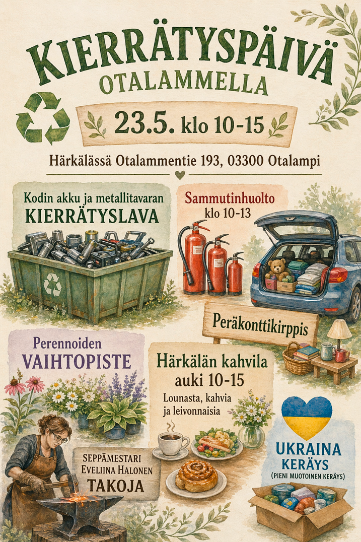 Härkälässä, (Otalammentie 193) järjestetään perinteinen kierrätyspäivä. Ohjelmassa mm: * Peräkonttikirppis * Romumetallin ja akkukeräys (Otalammen kyläyhdistyksen hyväksi) * Ukraina-keräys * Perenna-/taimivaihto * Sammutinhuolto * Härkälän kahvilassa lounasta, kahvia ja leivonnaisia * OtaVoiman avoimet ovet * Seppämestari Eveliina Lue lisää